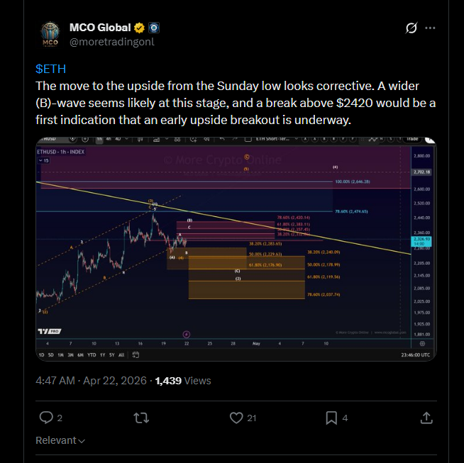 De (A)-(B)-(C) correctieve structuur die MoreTradingOnline schetst, plaatst ETH in het midden van een (B)-golfstijging. Als die lezing klopt, kan een (C)-golf daling volgen — met Fibonacci-doelen die zich uitstrekken naar $2.176 of zelfs $2.037 voordat enig echt herstel opbouwt.